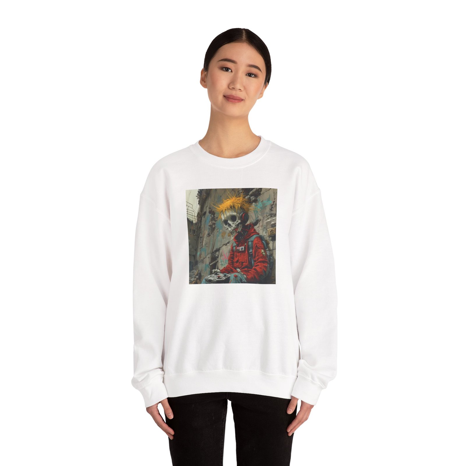 A cozy and durable sweatshirt featuring a punk skeleton skater with a game controller in his hand, perfect for those who love edgy and unique designs. This sweatshirt is ideal for adults looking for a comfortable and stylish option for colder months. It would make a great gift for fans of punk aesthetics and gaming enthusiasts. Relevant for Halloween, gaming events, and casual everyday wear.