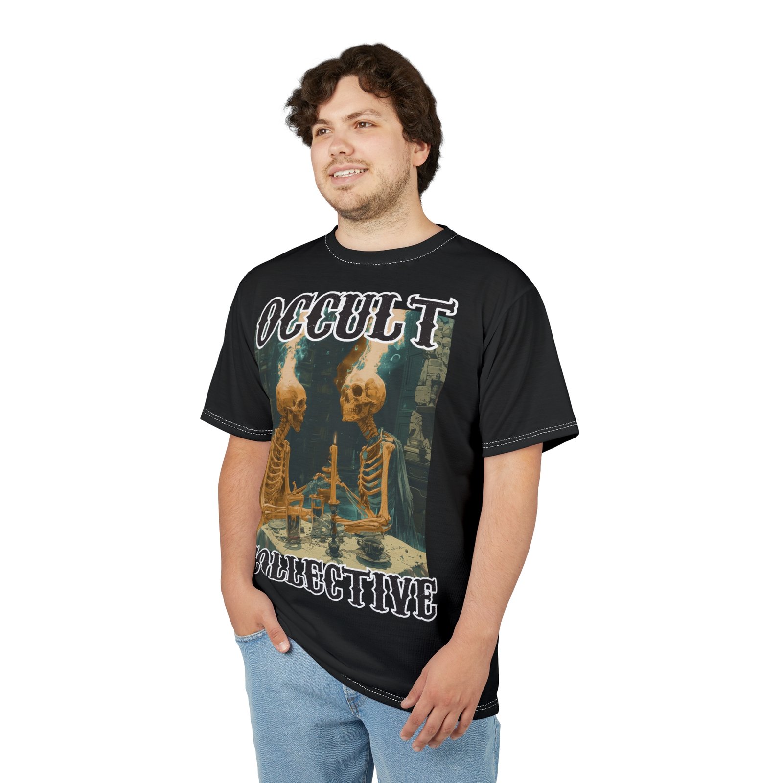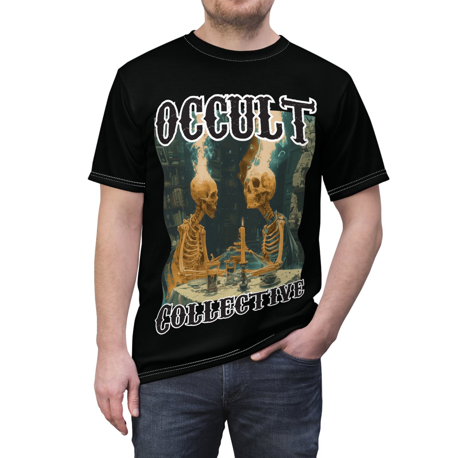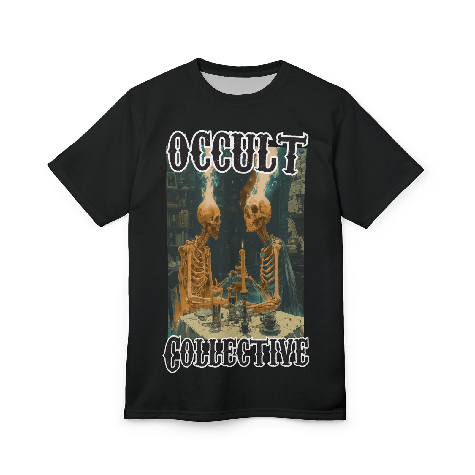 A unique tee featuring 2 skeletons sitting at a dining table contemplating the ether. This tee gives off a mysterious and Halloween vibe, perfect for those who love dark and eerie aesthetics. Ideal for Halloween parties, gothic enthusiasts, and anyone who enjoys a touch of the macabre in their wardrobe.