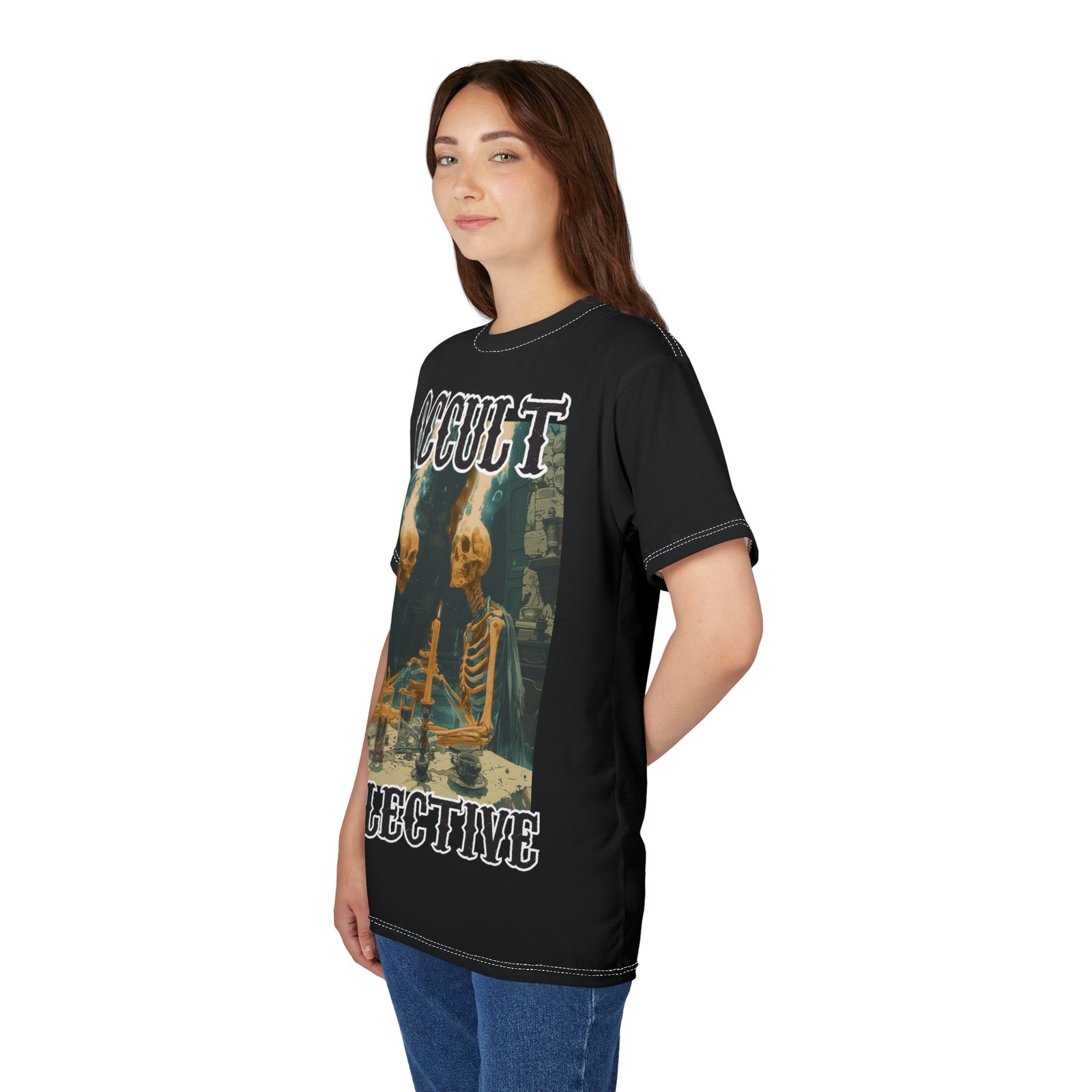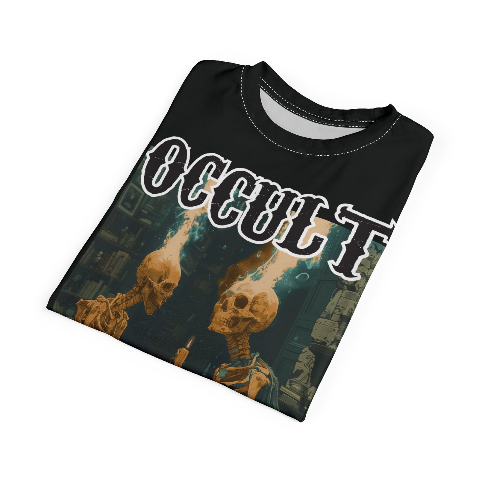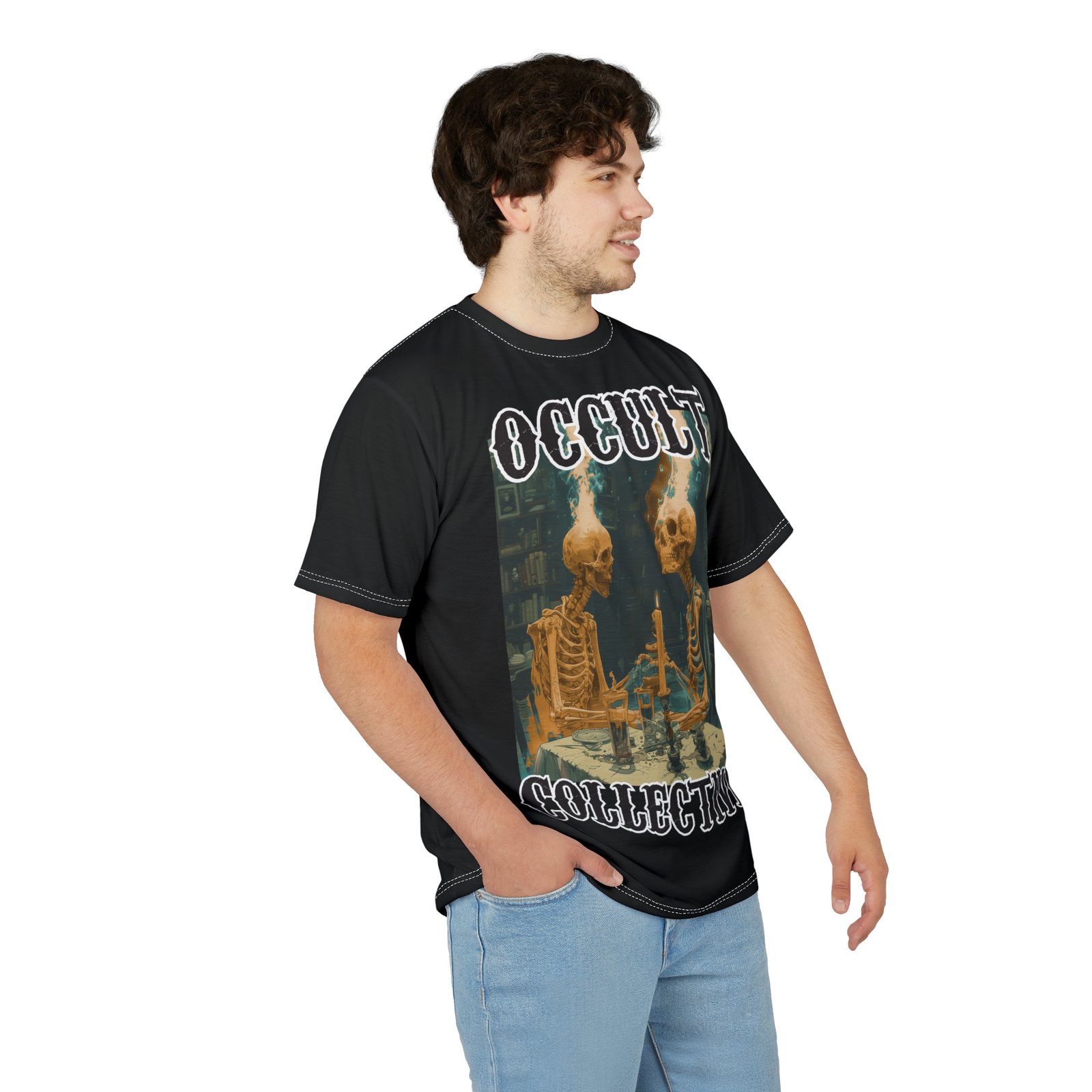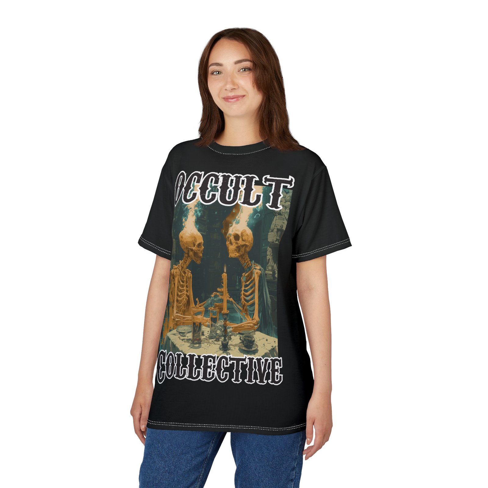 A unique tee featuring 2 skeletons sitting at a dining table contemplating the ether. This tee gives off a mysterious and Halloween vibe, perfect for those who love dark and eerie aesthetics. Ideal for Halloween parties, gothic enthusiasts, and anyone who enjoys a touch of the macabre in their wardrobe.