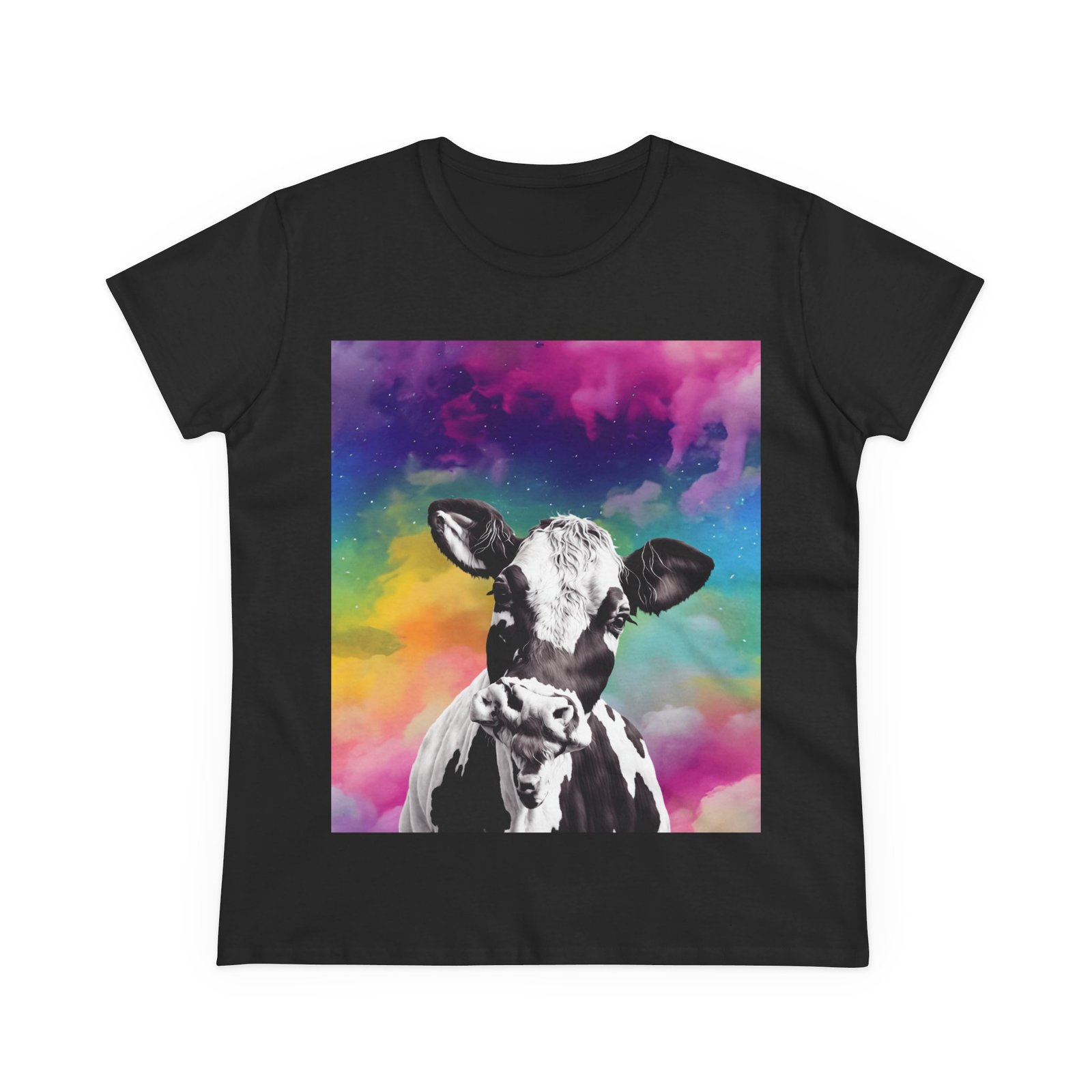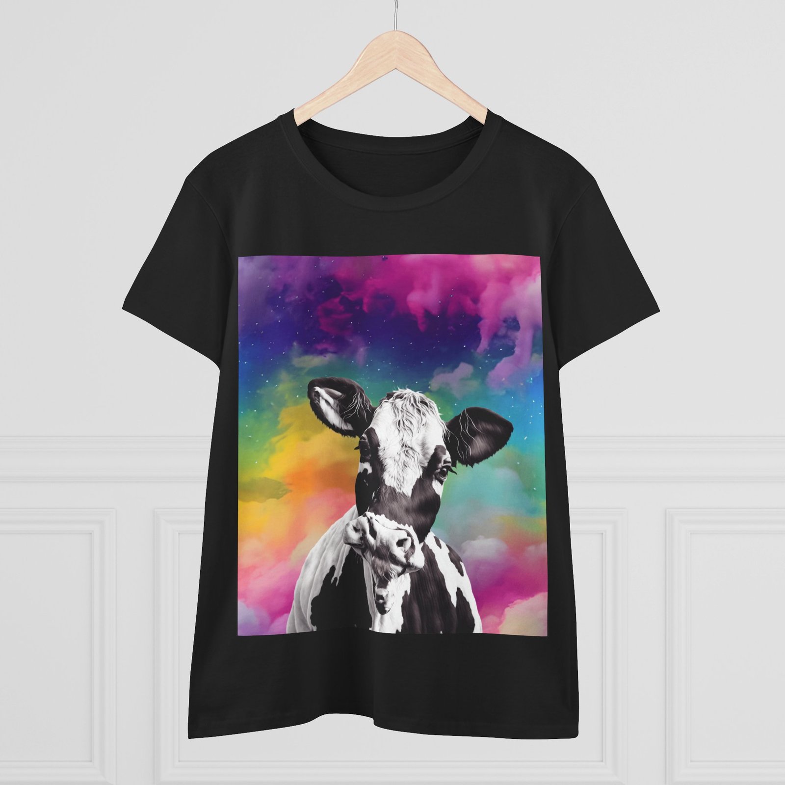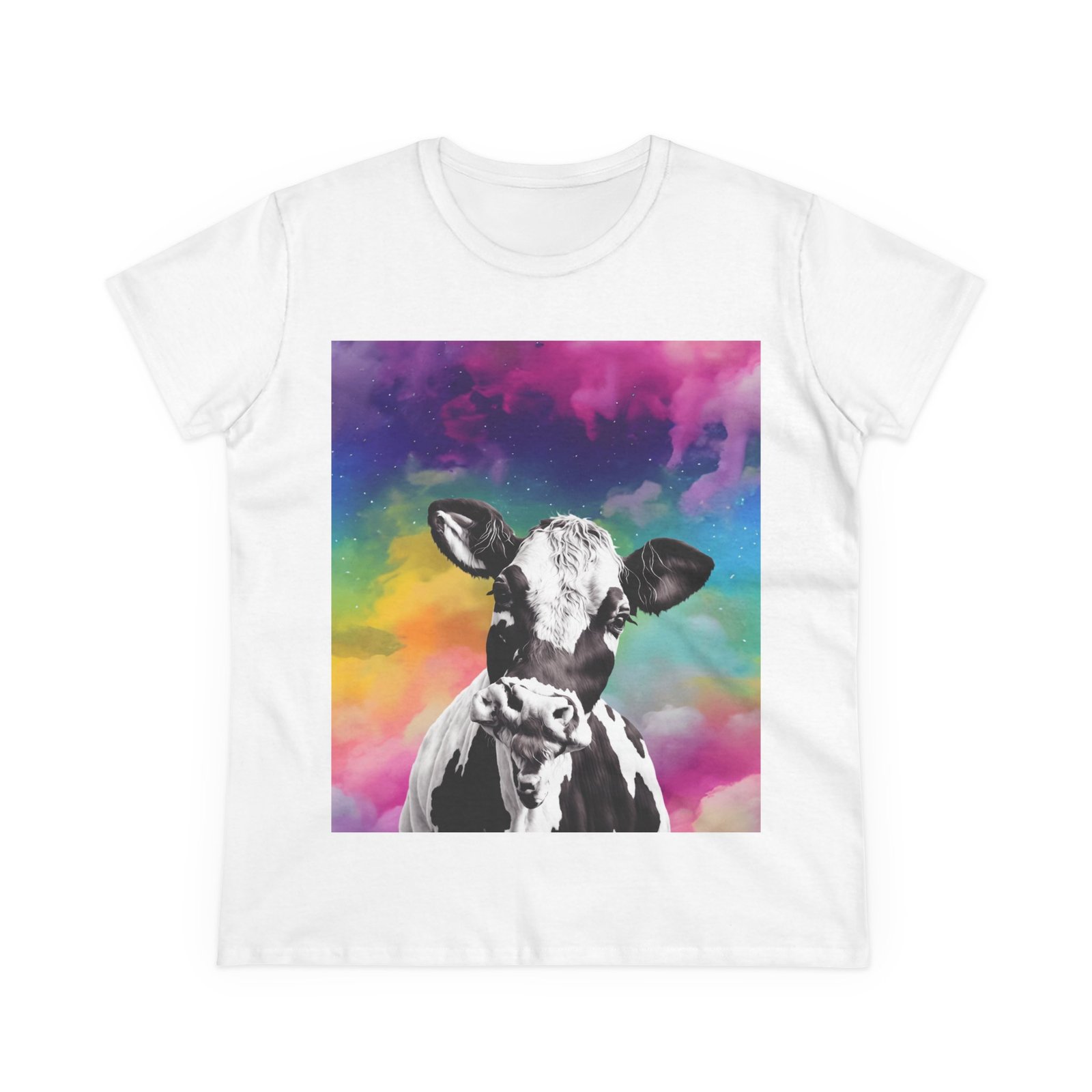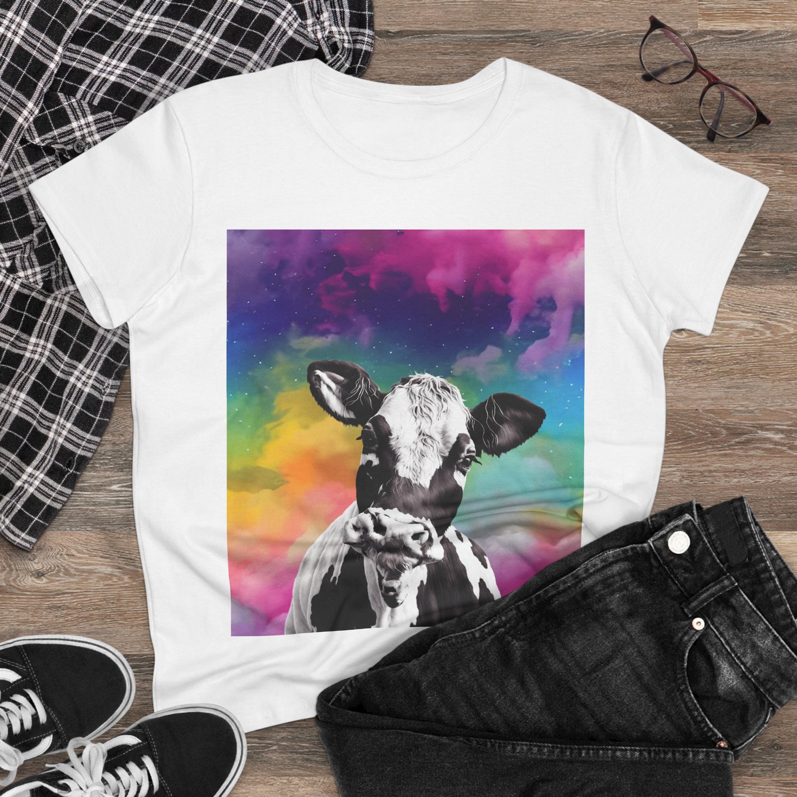A cheerful, cow graphic tee with a playful expression and a lively, colorful background filled with psychedelic colors, radiating joy and adding a magical touch to the scene. This tee is perfect for women who love unique and vibrant designs, and it is relevant for casual wear, summer celebrations, and fun outings.
