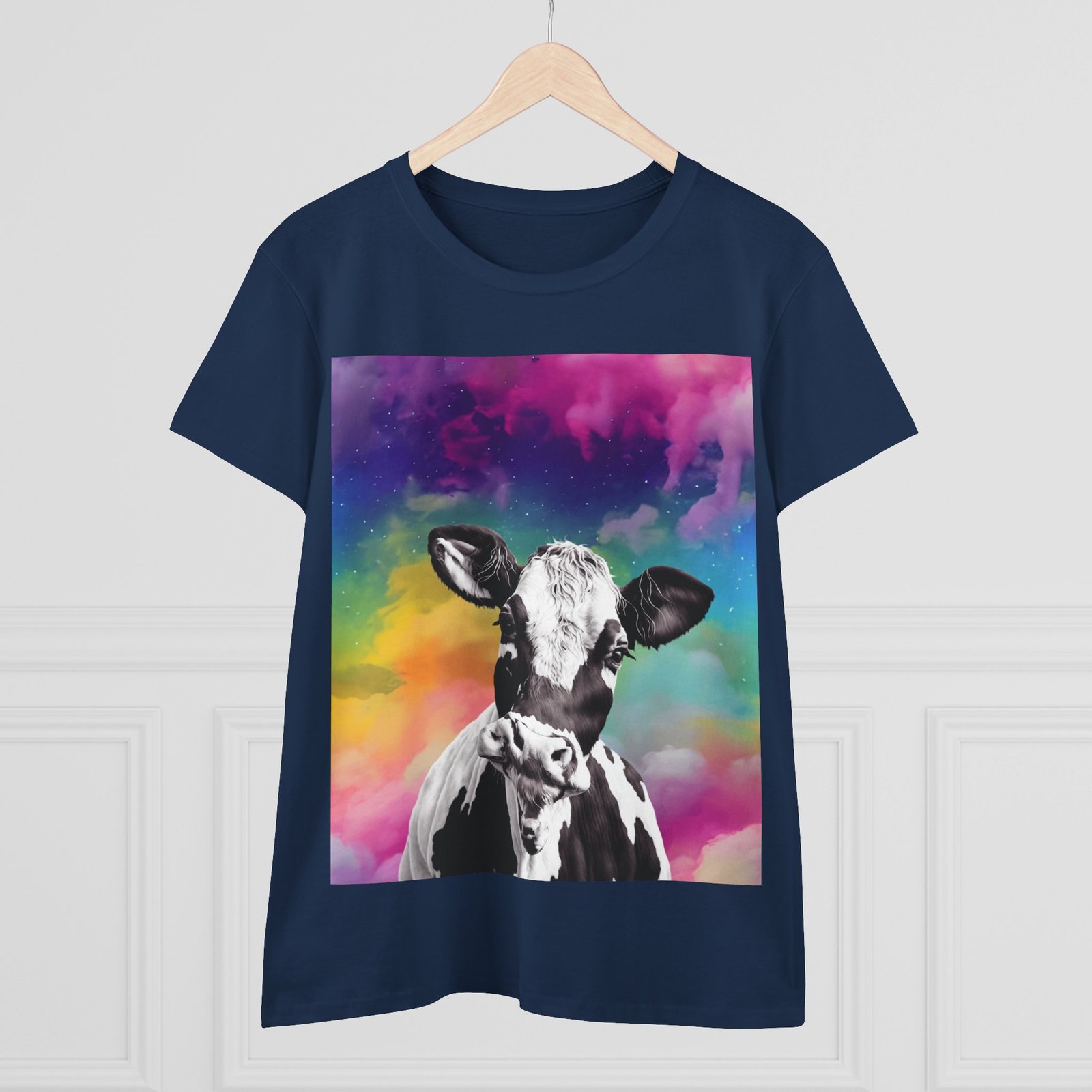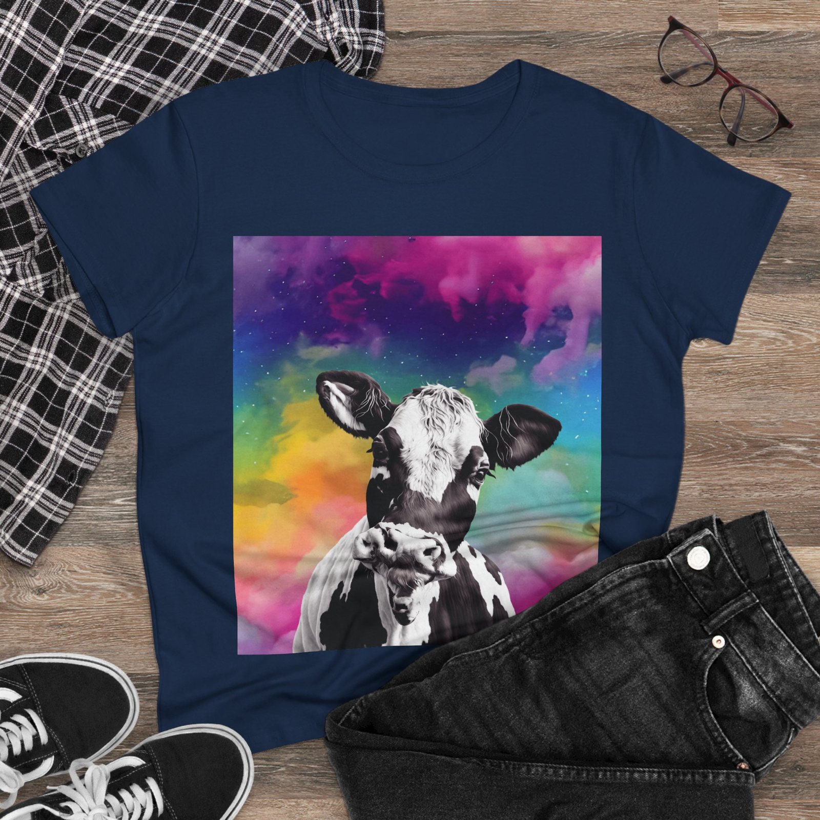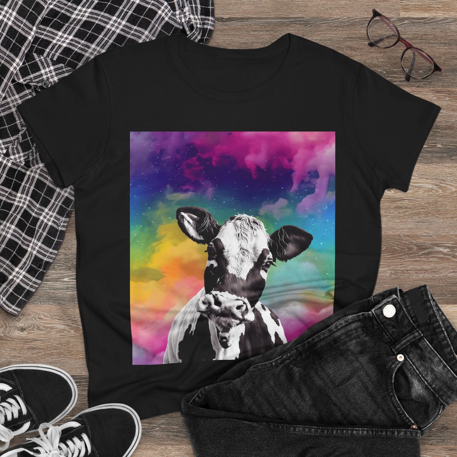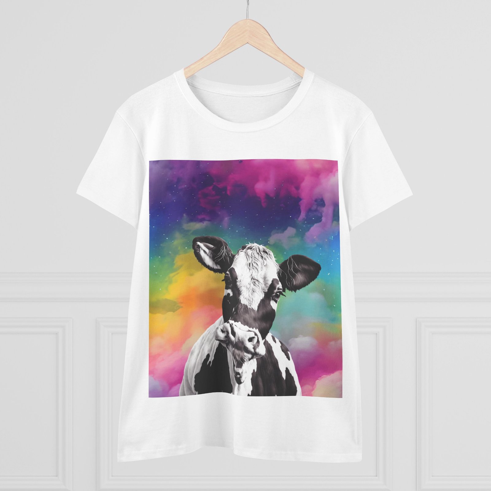 A cheerful, cow graphic tee with a playful expression and a lively, colorful background filled with psychedelic colors, radiating joy and adding a magical touch to the scene. This tee is perfect for women who love unique and vibrant designs, and it is relevant for casual wear, summer celebrations, and fun outings.