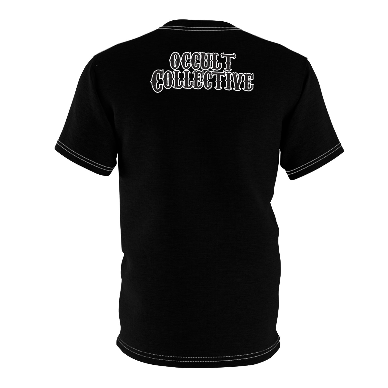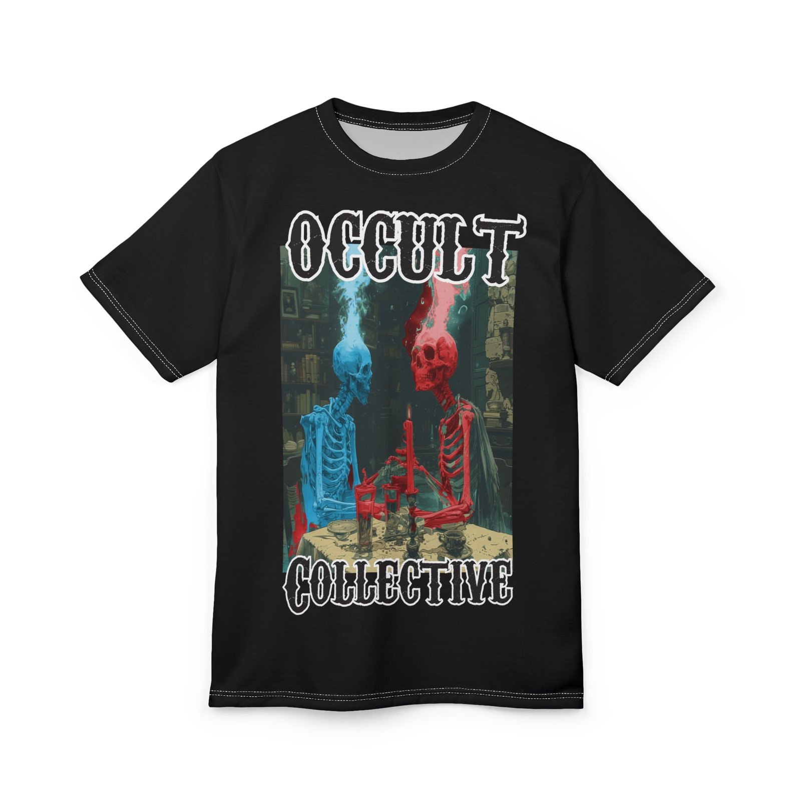 A unique tee featuring 2 skeletons sitting at a dining table contemplating the ether. This tee gives off a mysterious and Halloween vibe, perfect for those who love dark and eerie aesthetics. Ideal for Halloween parties, gothic enthusiasts, and anyone who enjoys a touch of the macabre in their wardrobe.
